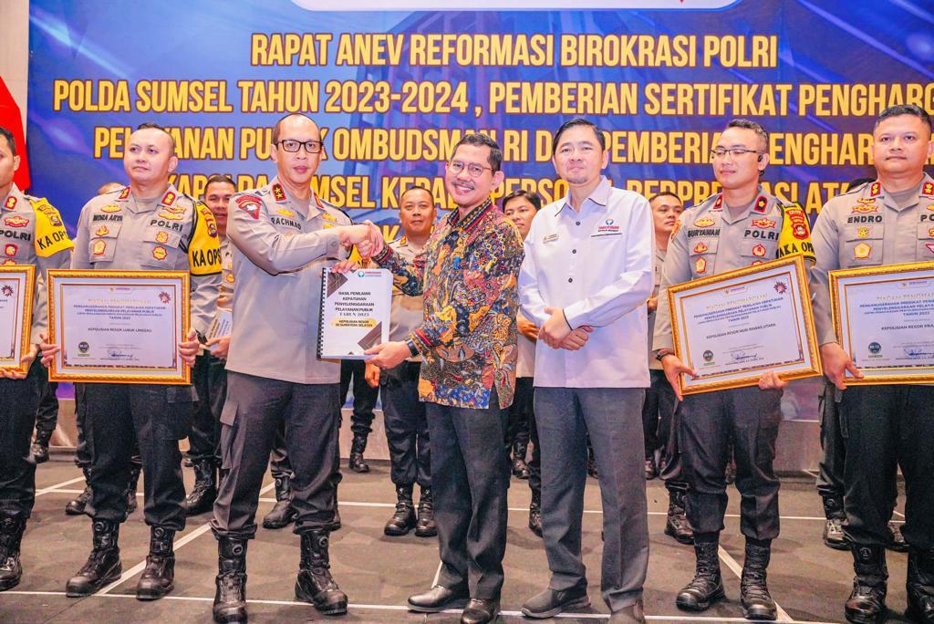 Saat Kapolda Sumatera Selatan Irjen Rachmad Wibowo saat memberikan sambutan Anev reformasi birokrasi Polda Sumatera Selatan tahun 2023 “Polda Sumsel sangat berterima kasih kepada Ombudsman Republik Indonesia yang telah berkontribusi dalam memberikan masukan terhadap perbaikan pelayanan publik di Polda Sumsel berupa penelitian terhadap kegiatan pelayanan publik oleh satuan kerja, sehingga dengan adanya hasil penilaian dari penelitian tersebut maka satuan kerja yang menjadi objek penilaian akan melakukan perbaikan dalam rangka peningkatan pelayanan publik kepada masyarakat,” ujar Rachmad Wibowo.