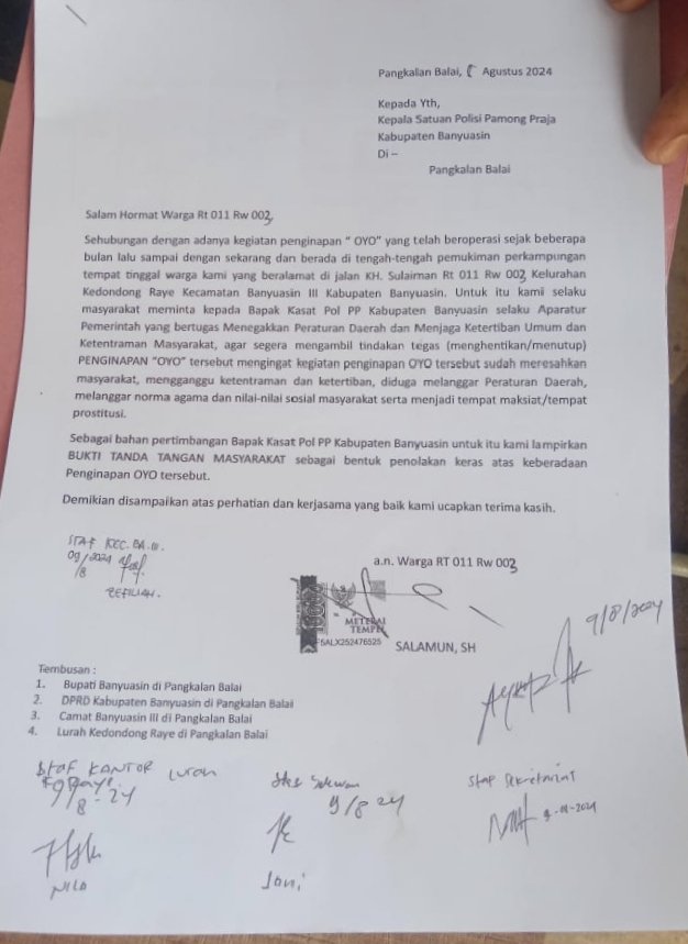 Surat laporan dilayangkan Salamun perwakilan warga RT 11 RW 003 yang ditujukan langsung kepada Kasat Pol PP kabupaten Banyuasin.