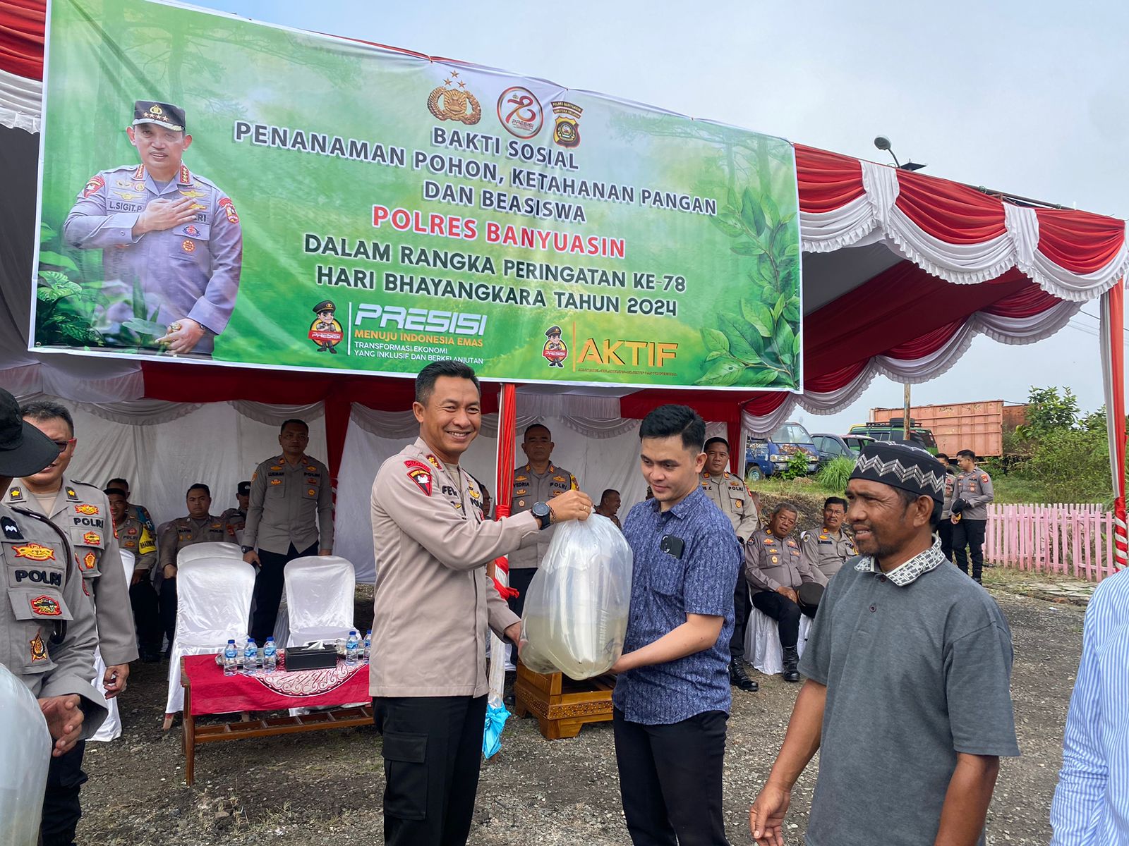 Banyuasin | Semarak | HUT Bhayangkara ke 78, Polres Banyuasin bakti sosial ketahanan pangan dan pemberian beasiswa kepada tiga pelajar berprestasi serta melakukan penanaman pohon.