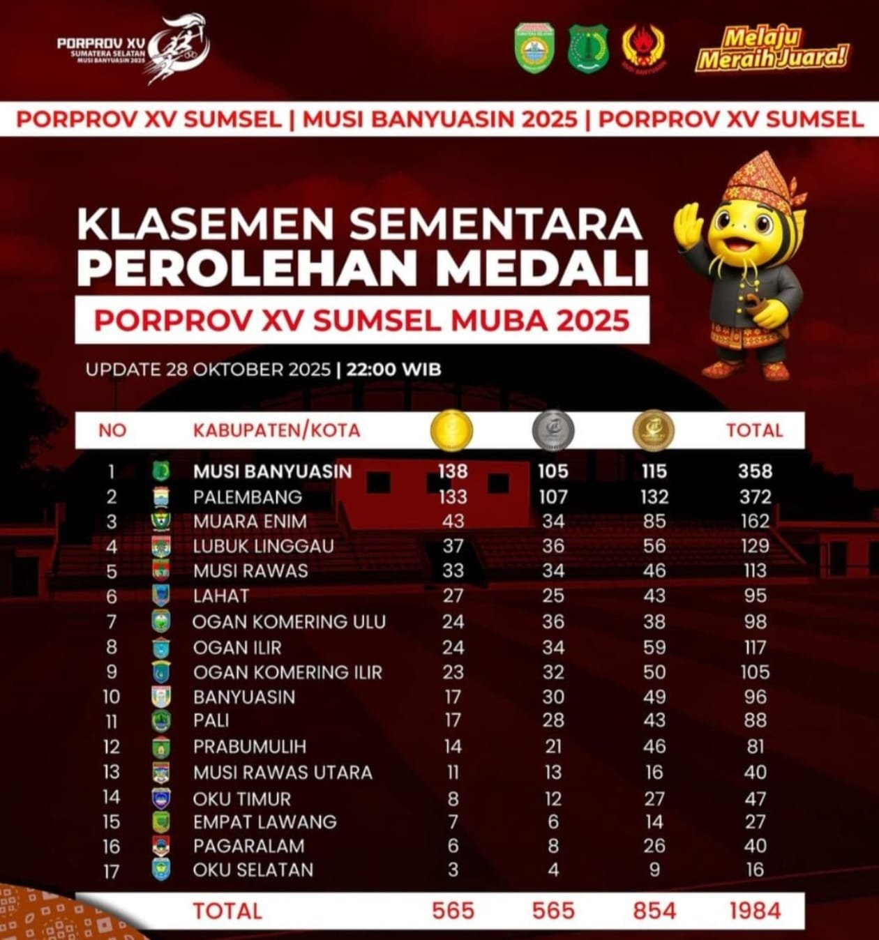 Tuan rumah, Musi Banyuasin masih memimpin klasemen dengan 358 medali, disusul Palembang di posisi Kedua dengan 372 medali dan Muara Enim di peringkat Ketiga dengan 162 medali.