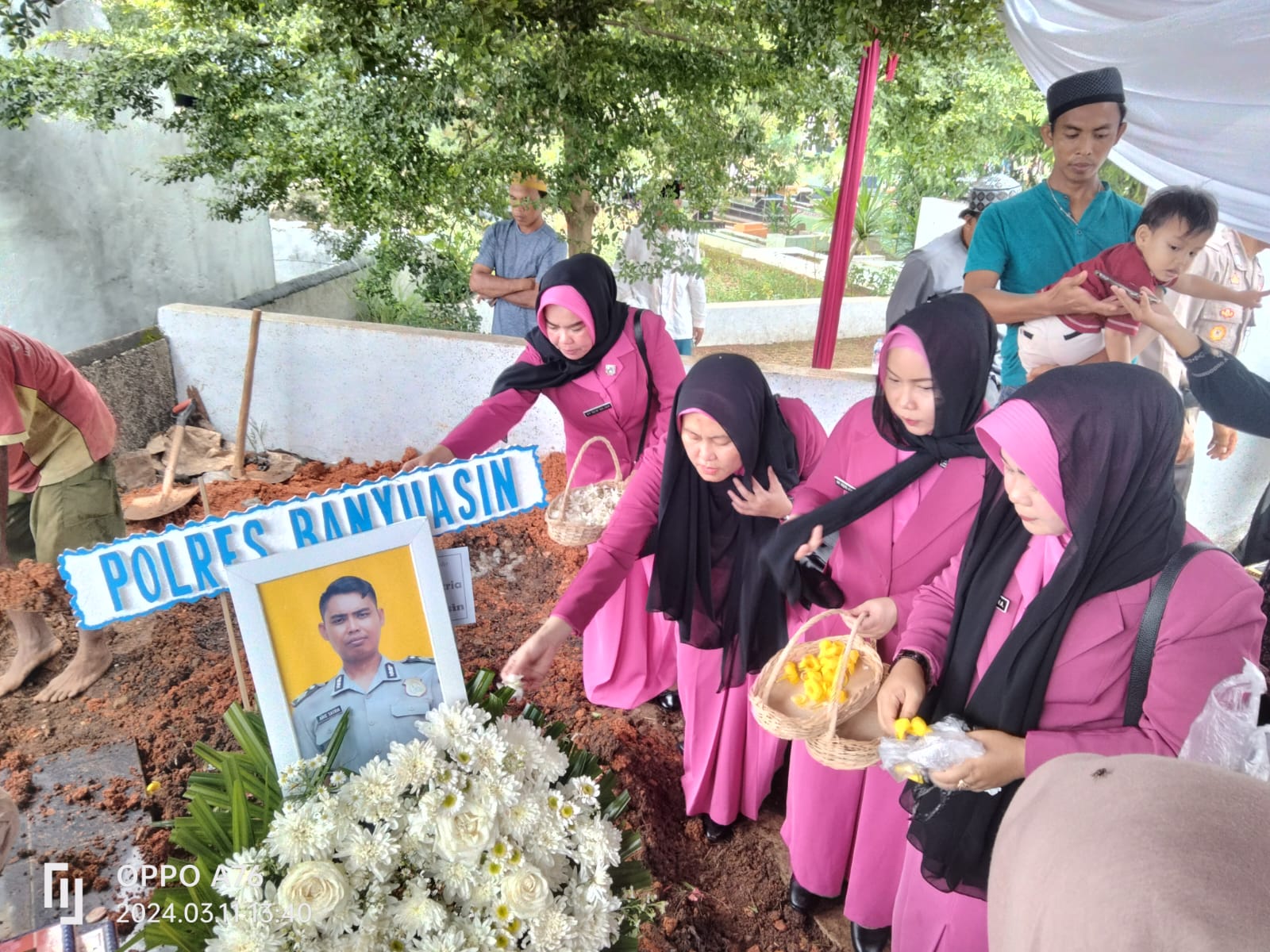 Palembang [ Berduka ] Kapolres Banyuasin AKBP Ferly Rosa Putra SIK pimpin upacara pemakaman almarhum Bripka Arie Satria di Tempat Pemakaman Umum (TPU) Sukamaju Kota Palembang. Senin (11/3).